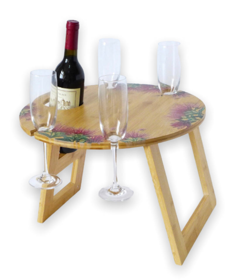 This eco friendly Bamboo table holds one bottle of wine or champagne and four glasses safely off the ground with style. Perfect for the beach, outdoor picnics. It is easy to transport and store in your car, motorhome, caravan or boat. Weight: 0.6kg CARE INSTRUCTIONS