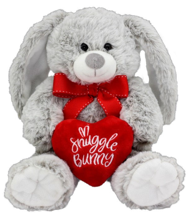 Grey Rabbit with Red Ribbon Holding Red Heart Printed With Snuggle Bunny.
